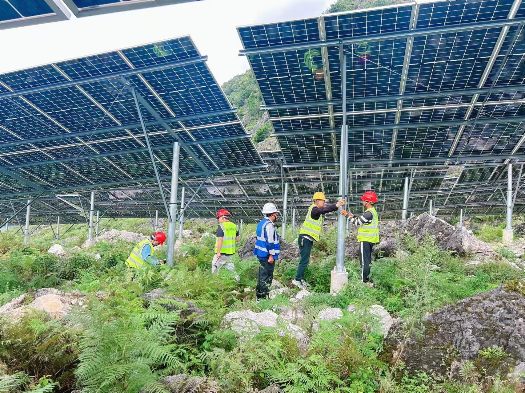 2025年5月31日,當(dāng)最后一組電流匯入電網(wǎng),中國電建集團(tuán)貴州工程有限公司承建的云南省紅河州“風(fēng)光儲”一體化基地核心項目——瀘西縣大歹魯、孔照普198兆瓦光伏電站宣告全容量并網(wǎng)發(fā)電!漫山遍野的光伏矩陣,猶如群山披上藍(lán)色“鎧甲”,在熾熱陽光下汲取源源不斷的能量,產(chǎn)生年均2.48億度綠電,奔向城市鄉(xiāng)村、點亮萬家燈火,譜寫著能源革命新時代華章。 峰林疊嶂 挑戰(zhàn)滇東南“喀斯特天塹” 紅河州山川毓秀,卻也地形崎嶇。項目場區(qū)是典型的喀斯特地貌,猶如大地嶙峋的筋骨,施工作業(yè)面星羅棋布,大型設(shè)備運輸舉步維艱;發(fā)育復(fù)雜的溶洞網(wǎng)絡(luò)如同潛伏的暗河,給樁基施工帶來嚴(yán)峻挑戰(zhàn),疊加雨季滂沱沖刷加劇的滑坡風(fēng)險,給緊迫工期增添了無形枷鎖。“山陡、地散、洞險、天變”四重天塹,成為項目團(tuán)隊必須征服的堡壘。 作為“風(fēng)光儲”一體化基地核心引擎,項目承載著輸送清潔能源、樹立轉(zhuǎn)型標(biāo)桿的雙重重任。項目工程、物資、安全、經(jīng)營、綜合五部一體,攥指成拳!項目班子成員帶領(lǐng)五大部門精銳盡出,一場攻堅硬仗就此打響。 攻堅克難? 智慧完成“溶洞之基”“陡坡之舞” 在嶙峋山石與隱秘的地下世界,項目團(tuán)隊以科技為刃,匠心為錘,運用地質(zhì)雷達(dá)進(jìn)行精準(zhǔn)掃描,透視鎖定溶洞位置與規(guī)模,然后制定專項方案對所有探測到的溶洞隱患點實施高強(qiáng)度混凝土精準(zhǔn)灌注!攪拌車轟鳴攀上山脊,泵管長龍深入地下裂隙,高標(biāo)號混凝土源源注入溶洞空腔,在喀斯特“暗河”之上筑起堅不可摧的基座。每一次成功灌注,都是現(xiàn)代工程智慧填補(bǔ)億萬年地質(zhì)空洞的無聲對話。 30度以上的陡坡是光伏板安裝的天然屏障,大型吊裝設(shè)備只能望坡興嘆,物料人工運輸效率低下。項目部集思廣益、群策群力,設(shè)計巧妙的“陡坡模塊化運輸鏈”:將笨重支架分解為不超過50公斤的輕便單元,架設(shè)輕型索道作為陡崖間的空中走廊;施工人員背負(fù)肩扛,上演了一場場充滿力量與協(xié)作的“陡坡之舞”。安全環(huán)保部親臨督戰(zhàn)、全程護(hù)航,現(xiàn)場安全繩、防墜網(wǎng)層層布控,確保極限坡度上的每一次攀爬與安裝都穩(wěn)如磐石。雨季滂沱,項目部見縫插針,覆蓋防水布、開挖排水渠;冬季濕冷,實施人員保暖與設(shè)備防潮雙重措施保證工程進(jìn)度……滇東南喀斯特的險峻,最終在建設(shè)者的智慧、汗水被馴服。 政企同心? 破局“征地”關(guān)鍵一役 征地是項目推進(jìn)的前提。高度分散的作業(yè)面牽涉多元主體權(quán)益,征地協(xié)調(diào)成為決定成敗的“戰(zhàn)略咽喉”。項目班子展現(xiàn)高度智慧與執(zhí)行力,積極聯(lián)動建設(shè)單位宏橋瀘西新能源有限公司,與地方政府部門展開高頻次、高效率的專項攻堅溝通。他們攜帶著科學(xué)嚴(yán)謹(jǐn)?shù)囊?guī)劃和切實可行的解決方案,反復(fù)穿梭于項目現(xiàn)場與政府辦公地之間,目標(biāo)明確、務(wù)求實效。 政企協(xié)同匯聚成征地破局的磅礴力量,經(jīng)過無數(shù)次溝通、協(xié)商與調(diào)整,分歧得以彌合,心結(jié)逐漸解開。生機(jī)勃發(fā)的四月,最后一塊關(guān)鍵用地的障礙被徹底掃清!不僅為項目全速推進(jìn)按下“加速鍵”,更在當(dāng)?shù)匕傩招闹胁ハ铝死斫馀c信任的種子,奠定了堅實的社會與民心基礎(chǔ)。 初夏沖刺? 鑄就攻堅克難“紅河速度” 突破征地瓶頸吹響了全容量并網(wǎng)的總攻號角。此時,距離“5.31”全容量并網(wǎng)節(jié)點已不足兩月,而剩余高達(dá)70兆瓦的支架組件安裝、電纜敷設(shè)及電氣設(shè)備調(diào)試任務(wù)壓力山大。 項目團(tuán)隊聞令而動進(jìn)入“極限攻堅”模式。分公司領(lǐng)導(dǎo)靠前指揮、統(tǒng)籌資源;項目部開啟“白加黑”、“五加二”輪番突擊。施工現(xiàn)場,機(jī)器轟鳴如鼓點,焊花飛濺似禮花;施工方案細(xì)化到每個山頭、每處方陣;物資部精心統(tǒng)籌,確保“糧草”精準(zhǔn)及時送達(dá);安環(huán)部巡查員全程監(jiān)督,嚴(yán)守安全紅線……參建各單位鼎力支持與高效協(xié)同,為沖刺注入強(qiáng)大動力。 艱辛和汗水澆出奇跡,不到2個月,光伏區(qū)所有光伏板精準(zhǔn)安裝就位,陡坡上披滿藍(lán)色鎧甲;數(shù)十公里電纜穿山越嶺,為群山注入能量血脈;一座座箱變、逆變器昂然矗立,調(diào)試現(xiàn)場燈光晝夜不息……貴州電建令人驚嘆的速度高效完成了70兆瓦光伏安裝! 并網(wǎng)凱歌? 點亮綠色未來 2025年5月31日,集控室監(jiān)控大屏上,發(fā)電功率曲線穩(wěn)穩(wěn)定格滿載數(shù)值,標(biāo)志著瀘西縣大歹魯、孔照普光伏電站198兆瓦容量一次性成功并網(wǎng)!現(xiàn)場一張張被高原陽光曬黑、被汗水浸透的臉龐,綻放出難以抑制的激動與自豪。 從前期踏勘步履維艱,到溶洞深處混凝土澆筑的隆隆回響;從陡坡運輸?shù)牟讲襟@心,到征地協(xié)調(diào)的耐心細(xì)致;從百日沖刺到捷報頻傳,項目全體參建人員以“逢山開路、遇水架橋”的氣魄,克服一切嚴(yán)酷挑戰(zhàn)高質(zhì)量履約,創(chuàng)造了光伏建設(shè)領(lǐng)域的“紅河速度”,為同類型山地光伏建設(shè)提供
