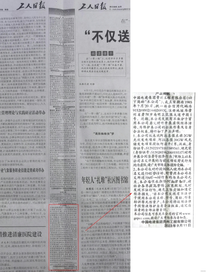 中國電建集團貴州工程有限公司(以下簡稱“本公司”),成立日期為1985年7月20日,統(tǒng)一社會信用代碼為91520000214402689X,注冊地址為貴州省貴陽市南明區(qū)花溪大道中段1號。 近期,本公司發(fā)現(xiàn)有不法分子冒用本公司名義對外開展虛假經濟活動,為維護本公司的企業(yè)形象及自身合法權益,特作如下嚴正聲明: 1、本公司從未就阿拉善盟左旗2GW光伏發(fā)電項目、阿拉善盟20GW風光儲發(fā)電項目授權何治平(男,漢族,身份證號:512922197510158934)、胡光榮(身份證號:513028196206019337)對外開展合同簽署等經濟行為,市場上以本公司名義開展的與前述項目有關行為均為虛假,請廣大市場主體謹防受騙。 2、本公司未對外授權他人使用本公司名義進行經營活動,對冒用本公司名義所進行的一切行為均與本公司無關,本公司不承擔任何法律責任,請社會各界提高警惕,注意甄別,及時發(fā)現(xiàn)不法行為,避免上當受騙和遭受經濟損失。若本公司發(fā)現(xiàn)有不法分子使用本公司名稱、字號、商標、形象標識等無形資產,本公司將運用法律手段堅決維護自身合法權益,追究違法者的全部法律責任。 本公司信息可參見本公司的官網m.tengfengdx.com,敬請廣大市場參與者知悉。 中國電建集團貴州工程有限公司 二0二三年九月十一日 |